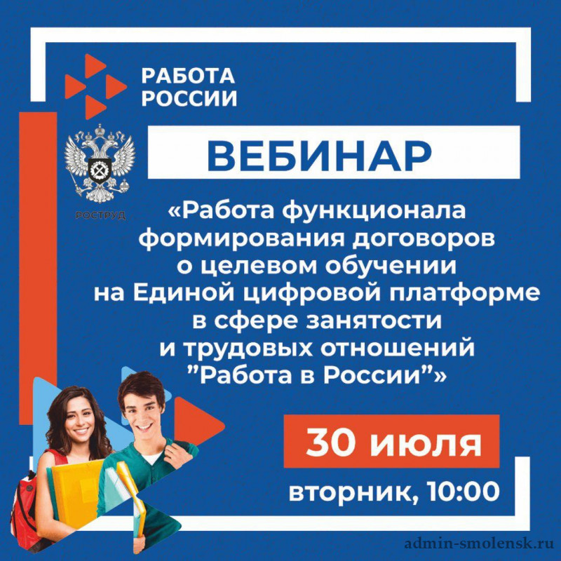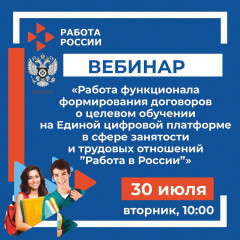 Федеральная служба по труду и занятости проводит вебинар по теме «Работа функционала формирования договоров о целевом обучении на Единой цифровой платформе в сфере занятости и трудовых отношений "Работа в России"».